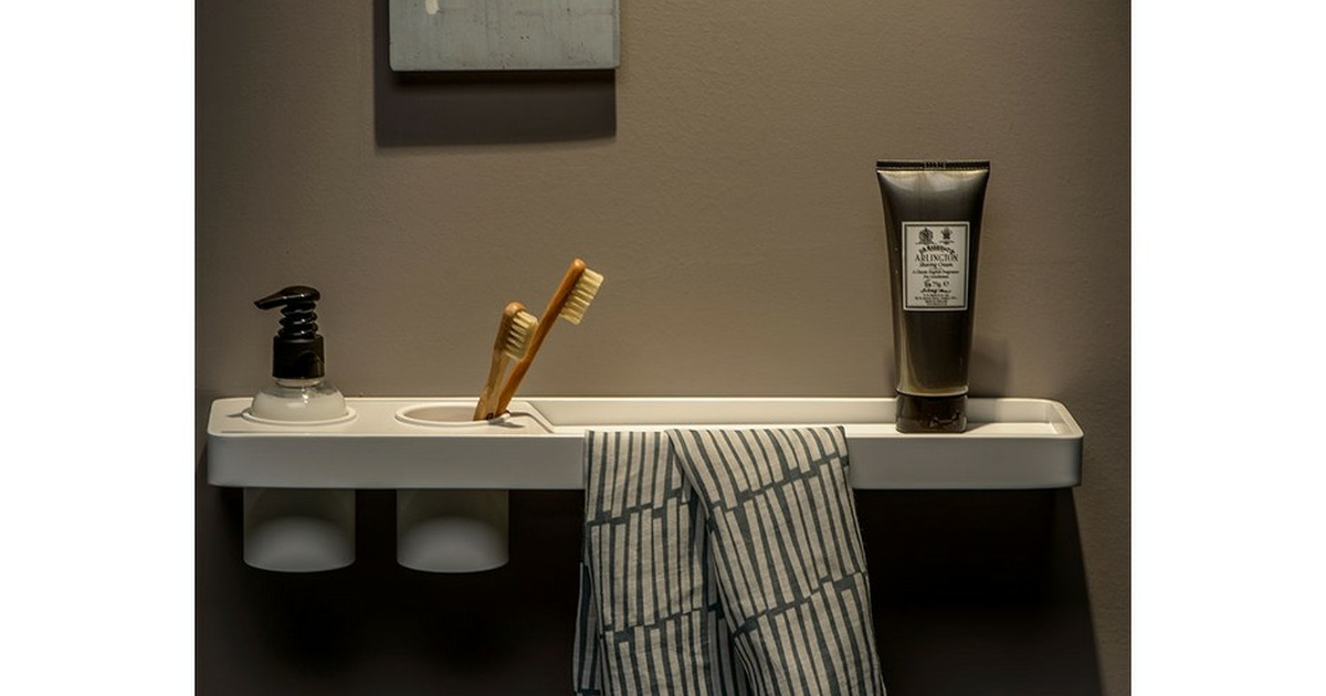 La mensola, oltre a essere un comodo piano di appoggio per gli oggetti del bagno e offrire due spazi supplementari per il bicchiere degli spazzolini o un flacone dispenser, funge da portasalviette e offre un robusto appiglio per gli ospiti con una portata massima di 150 kg.